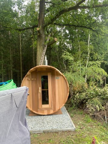 SAVO Fasssauna Panoram Rotes Zedernholz astig Ø 213 x L 310 cm